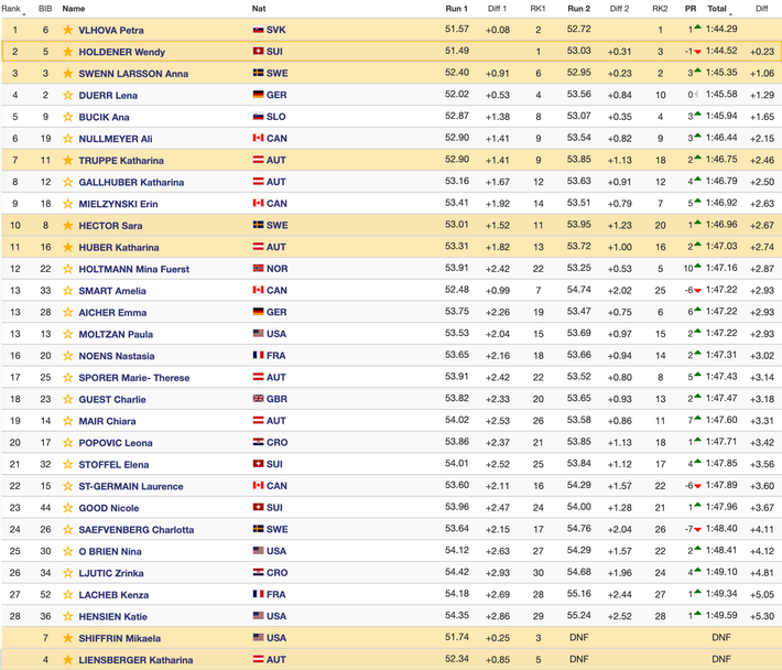 Словачката бе втора след първото минаване на „Подкорен 3“, но във второ не изпита затруднения и заличи пасива си от 0.08 спрямо водачката Уенди Холденер (Швейцария), която отново се размина с първата си победа. Все пак швейцарката завърши втора, а тройката бе запълнена от шведката Ана Свен-Ларсон, която остана на 1.06 зад Влъхова.