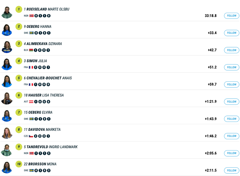 Втора финала, също с две наказателни обиколки, пресече шведката Хана Йоберг, която завърши на 33.4 секунди зад Рьозеланд. Трета остана белорускинята Динара Алимбекова, която също бе с 18/20 и спечели първия си подиум за сезона. Четвърто и пето място бяха за Франция, като те бяха завоювани съответно от Жулия Симон и Анайс Шевалие-Буше. За Симон днешният старт сложи край на серията от три поредни втори места в стартовете за Световната купа.