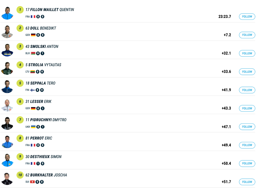 Французинът, който е и водач в генералното класиране за Световната купа, повали всичките си десет мишени и изпревари със 7.2 секунди бившия световен шампион в дисциплината Бенедикт Дол (Германия), който също беше безгрешен. Трети с един пропуска от положение прав се класира белорусинът Антон Смолски, за когото това е втори подиум през сезона, след третото място в спринта в Хохфилцен, Австрия.