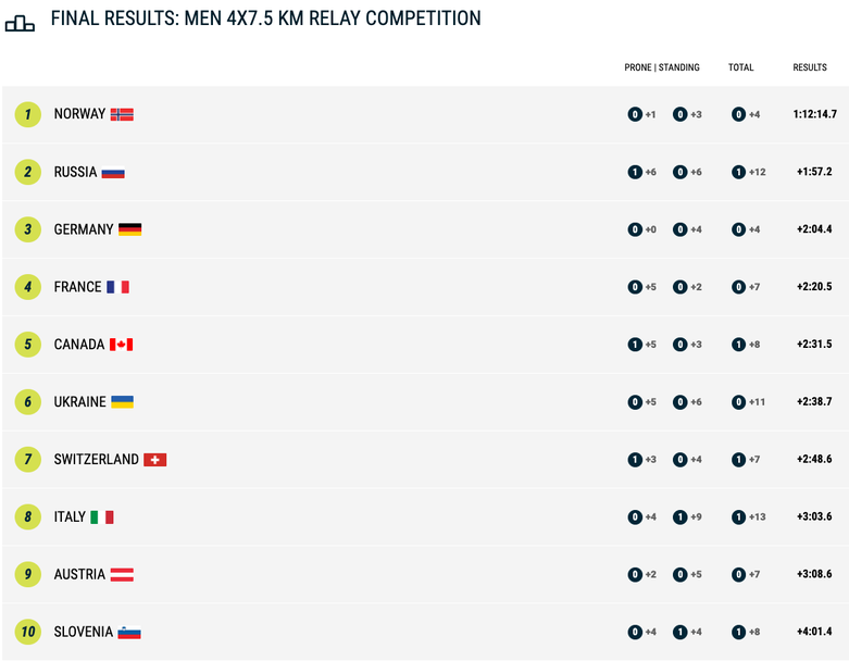 Викингите бяха недостижими в надпреварата в Антхолц-Антерселва, Италия и триумфираха с близо две минути пред Русия (Антон Бабиков, Даниил Серокхвостов, Александър Логинов, Едуард Латипов). Победителите имаха нужда от четири допълнителни изстрела и се опазиха от наказателната обиколка. В същото време руснаците направиха един тур от 150 метра и използваха 12 резервни патрона.