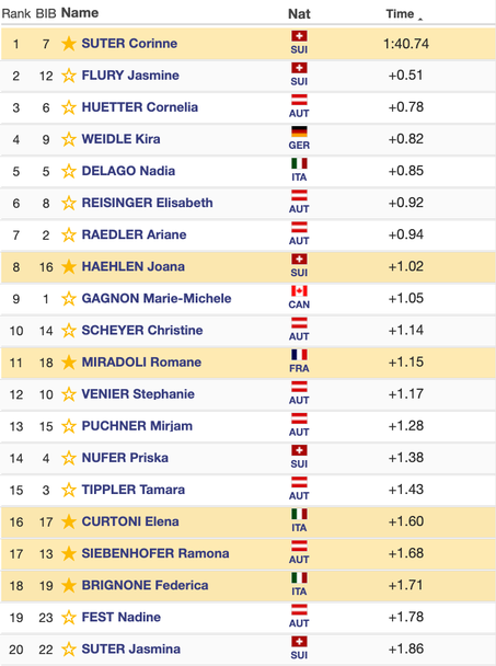 Швейцарката се възползва от отсъствието на най-добрите три в дисциплината от стартовете в Германия и с време от 1:40.74 стигна до победата на „Кандахар 1“. Втора се нареди нейната сънародничка Джасмин Флюри, която бе с 0.51 секунди по-бавна от Зутер. Подиумът бе затворен от австрийката Корнелия Хютер, която даде време с 0.78 по-слабо от това на първата.