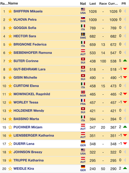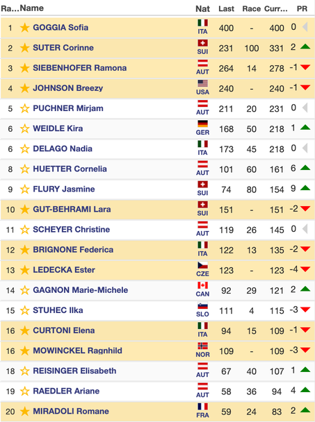 В битката за малкия глобус начело с 400 точки, въпреки че не участва днес, остава Годжа, втора с 331 вече е днешната победителка Зутер, а тройката с 278 затваря Рамона Зийбенхофер. Австрийката днес допусна няколко неточности по трасето и завърши едва 17-а.