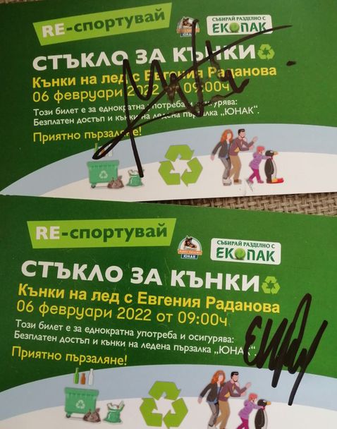 Близо 2 тона стъкло се събраха по време на съвместната кампания на организацията за разделно събиране на отпадъци от опаковки ЕКОПАК България и пързалка "Юнак" "RE-спортувай: Стъкло за кънки". Над 200 бяха предалите повече от 5 кг стъкло, които получиха талон за безплатно каране на кънки, а първите 30, донесли над 10 кг взеха участие в тренировката на Евгения Раданова и Найден Боричев. Сред тях бе и Калин от Трявна, който преди седмица предаде над 30 кг стъкло час и половина преди официалния старт на кампанията.