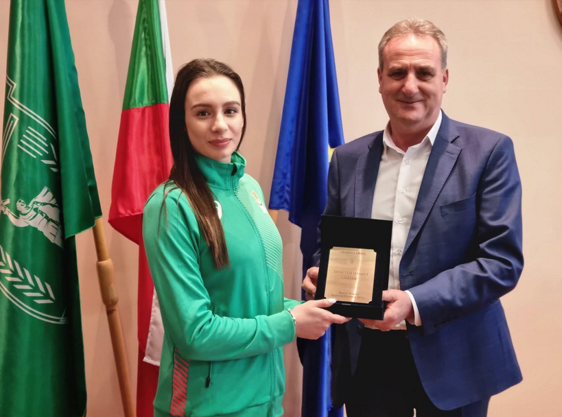 Кметът Васил Едрев изненада олимпийската ни гордост с наградата "Почетен плакет", с която Община Айтос удостоява само личности с изключителен принос към България и общината. С градоначалника, Мадлен сподели бъдещите си планове и му благодари за високата оценка и приза.