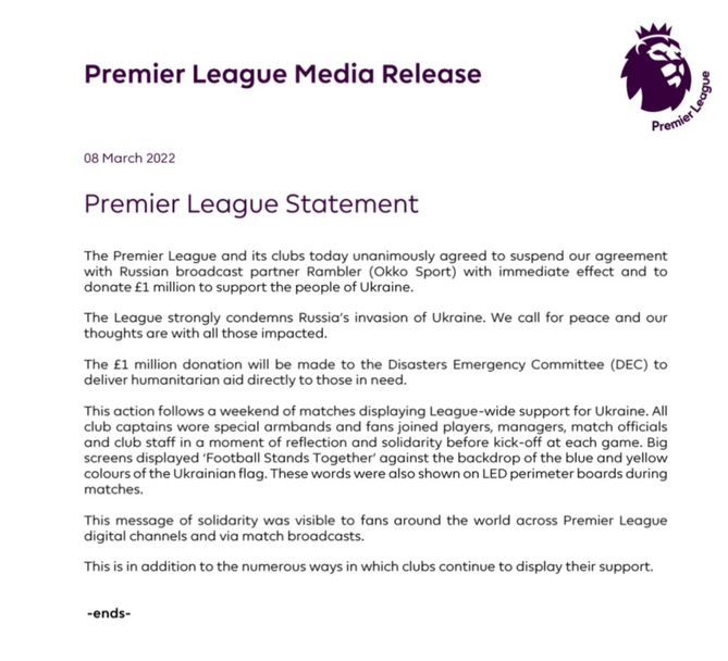 Висшата лига на Англия вече няма да се излъчва на територията на Русия, след като днес договорът за това беше прекратен от английска страна. Причина за това е военната инвазия на войските на Владимир Путин в Украйна.