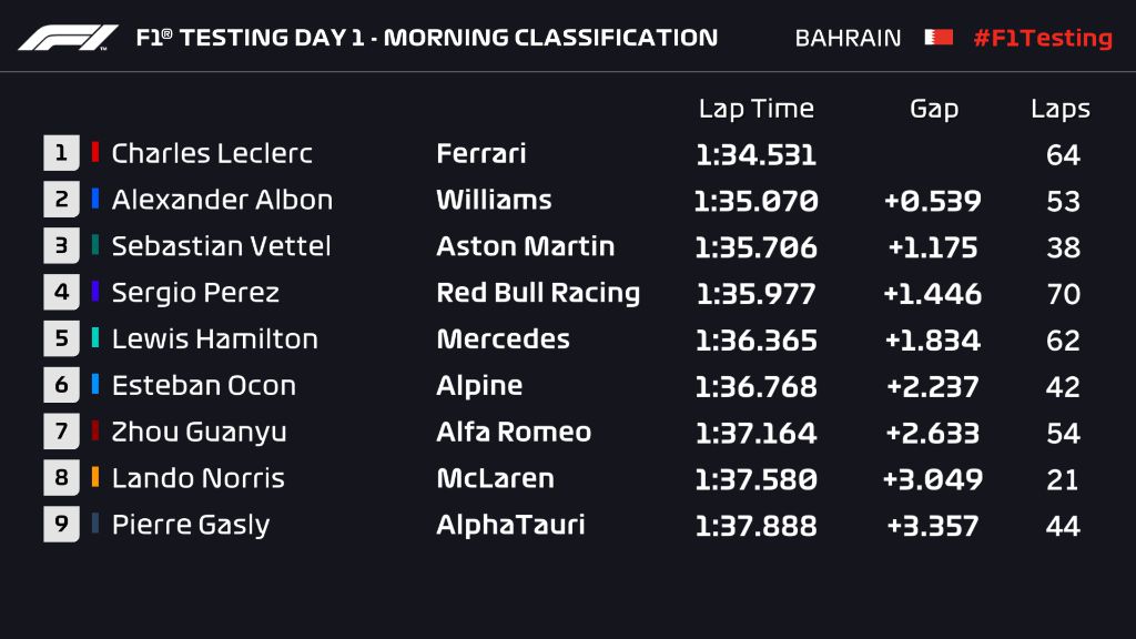 В следобедната сесия своето участие на теста в Бахрейн ще започнат и Джордж Ръсел, Карлос Сайнц, Фернандо Алонсо, Ланс Строл и Валтери Ботас, които ще заменят съответно Хамилтън, Леклер, Естебан Окон, Фетел и Гуаню Джоу в екипите на Мерцедес, Ферари, Алпин, Астън Мартин и Алфа Ромео. Перес, Норис, Пиер Гасли и Албън пък ще карат през целия ден, преди техните съотборници да прекарат цял ден зад волана утре.
