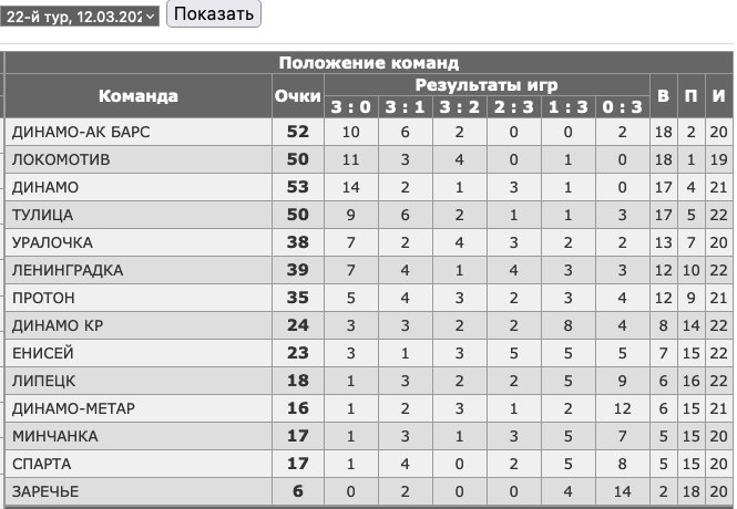 Динамо е трети с актив от 53 точки (17 победи, 4 загуби), Ленинградка е на 5-а позиция с 39 точки (12 победи, 10 загуби).