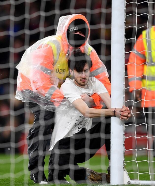 Млад мъж успя да нахлуе на терена по време на двубоя между Арсенал и Ливърпул в сряда вечер и дори направи опит да се завърже за гредата на едната врата. Това се случи през второто полувреме на срещата на “Емиратс”.