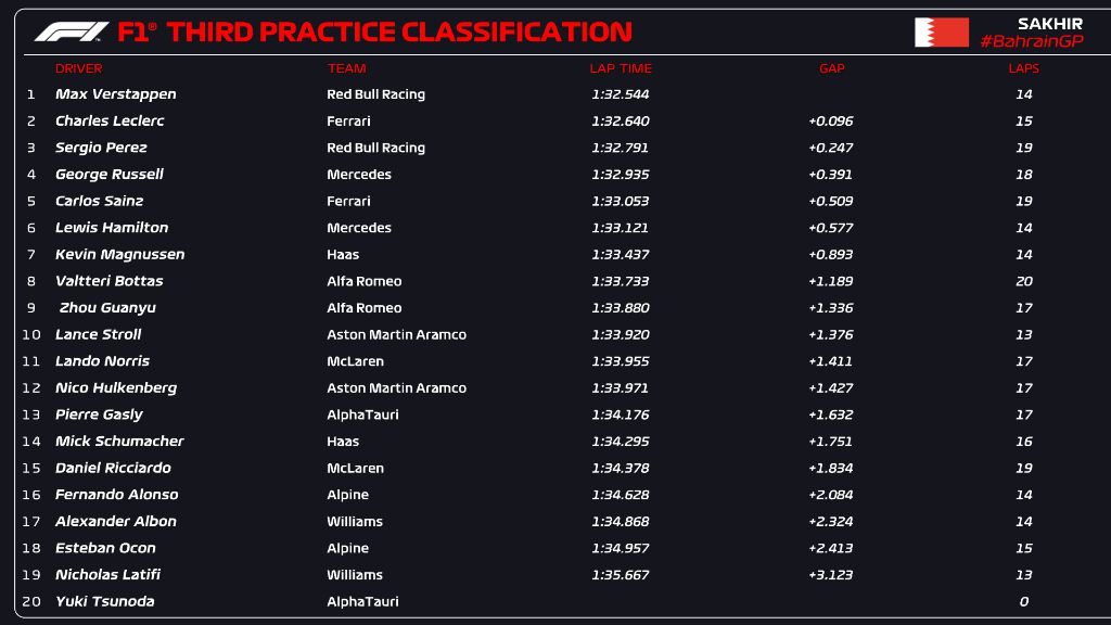 Петицата в края на последния час за подготовка на „Сахир“ затвориха Джордж Ръсел и Карлос Сайнц. Двамата бяха със съответно 0.391 и 0.509 по-бавни от първия. На 0.577 зад Верстапен сесията завърши седемкратният световен шампион Люис Хамилтън. Кевин Магнусен, Валтери Ботас, Гуаню Джоу и Ланс Строл бяха останалите пилоти, които намериха място в топ 10, което бе затворено на 1.376 от Верстапен.