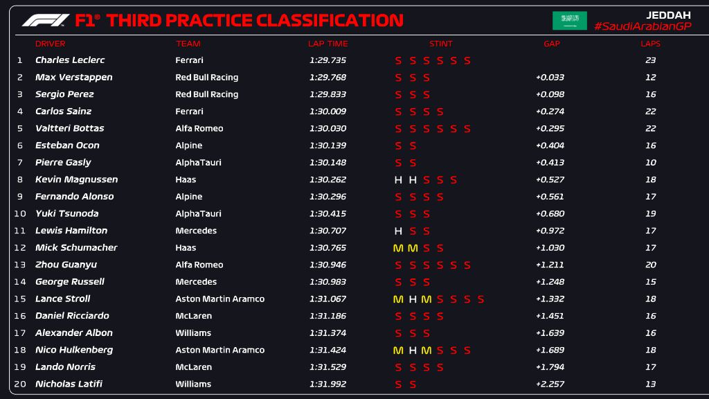 Любопитна подробност от последната тренировка в Джеда е, че всички пилоти, които използват двигатели на Мерцедес останаха извън топ 10. Най-близо до него бе Люис Хамилтън от заводския състав на „сребърните стрели“, който остана 11-и с пасив от 0.972. Неговият съотборник Джордж Ръсел завърши 14-и, а зад него се наредиха и пилотите на Астън Мартин, Макларън и Уилямс.