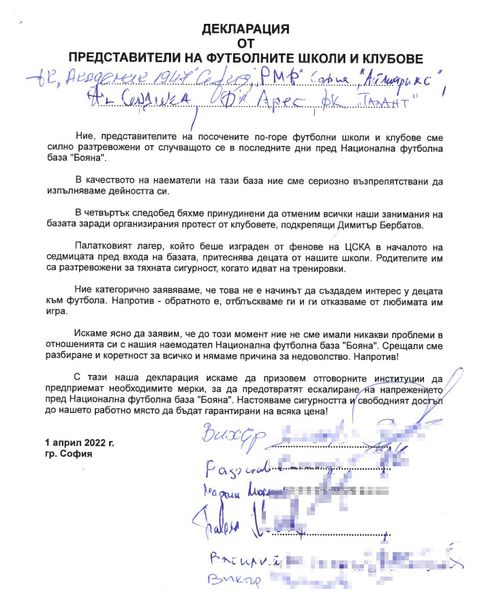 Шест аматьорски клуба излязоха с декларация, чрез която се обявиха против случващото се пред сградата на Българския футболен съюз. От написаното се разбира, че става въпрос за футболни школи и клубове, които са наематели на базата в Бояна. С декларацията си те призовават отговорните институции да предприемат необходимите мерки, за да предотвратят ескалиране на напрежението пред входа на футболната база.