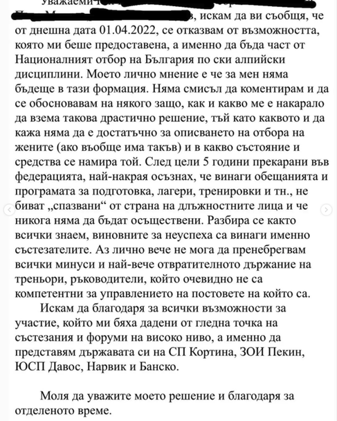 Тя е прикачила и писмото си, което е изпратила към ръководството на Българска федерация по ски.
