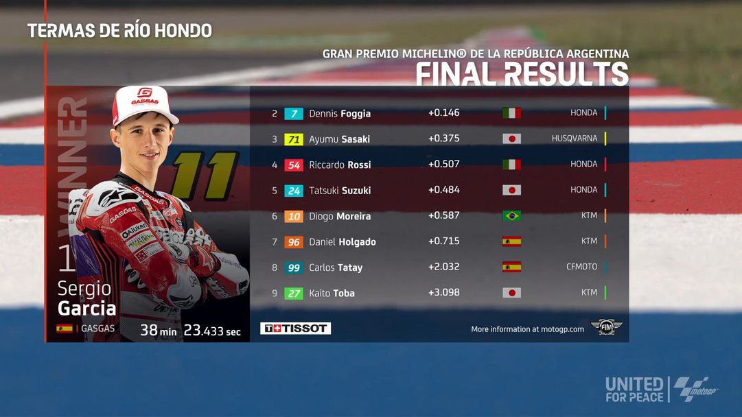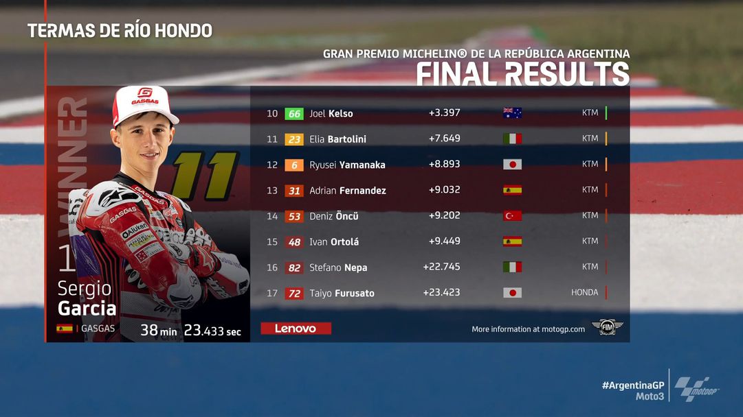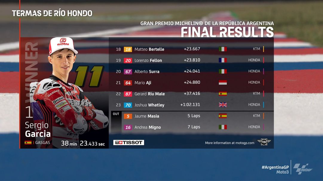 С две изпреварвания срещу пилотите на Леопрад Рейсинг в последната половин обиколка на Гран При на Аржентина испанецът Серхио Гарсия стигна до своята първа победа за сезон 2022 в клас Moto3 на световния шампионат по мотоциклетизъм на писта.