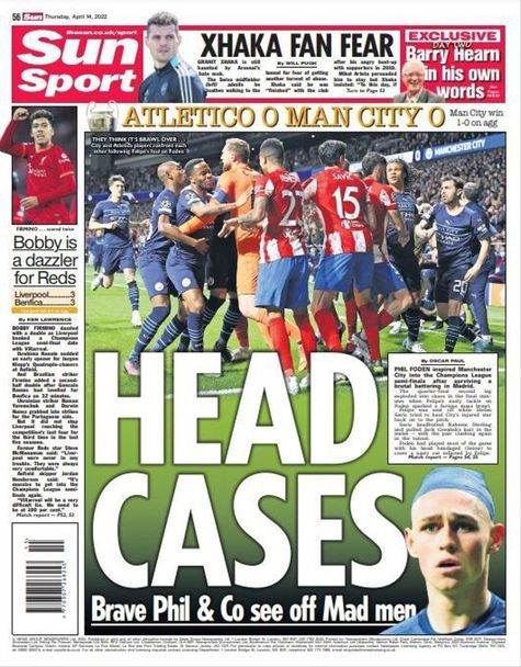 “Откачалки” е заглавието на “Сън”, откъдето допълват: “Смелият Фил и компания изхвърлиха лудите”. От “Гардиън” пишат: “Сити запазиха хладнокръвие във врящия котел на Атлетико”, добавяйки: “Биткаджийско реми в Мадрид запазва мечтата за требъл жива”. “Дейли Стар” пък излизат със следното заглавие: “Пълен хаос”, като също така пишат: “В Мадрид е лудост, докато Сити си го уредиха (полуфинала - б.р.)”.