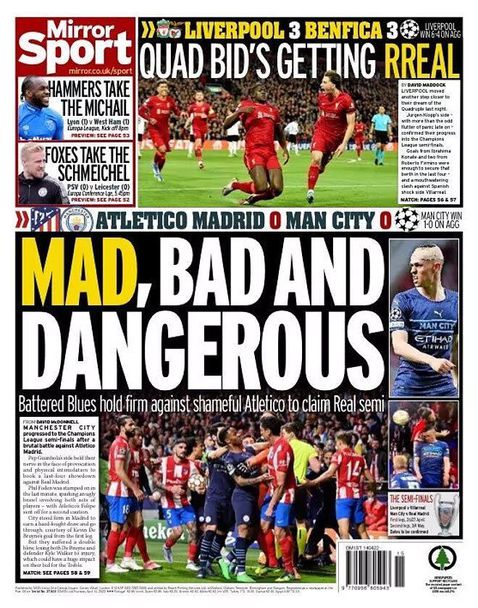 “Луди, лоши и опасни”, пише “Мирър”, добавяйки: “Пребитите “сини” удържаха позорния Атлетико, за да стигнат до полуфинал с Реал”. В “Дейли Експрес” също хвалят Сити, докато критикуват техния опонент: ““Синя” смелост”, гласи тяхното заглавие, което е допълнено от следния коментар: “Сити показаха самочувствие в луда нощ, за да си уредят сблъсък с Реал”.