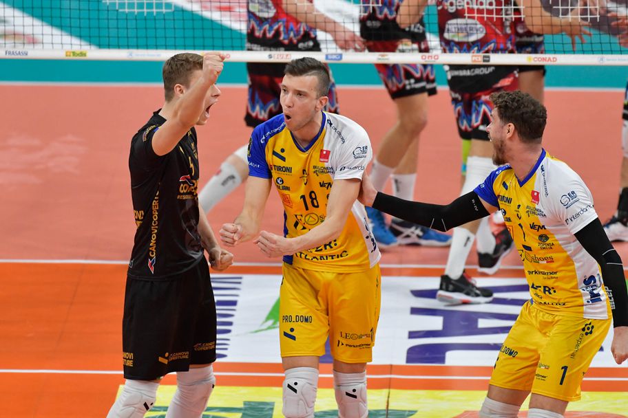 Отборът на Лео Шуус ПеркинЕлмер (Модена) изненада победителя в редовния сезон сър Сейфти Конад (Переджа) и го победи като гост с 3:1 (25:22, 22:25, 25:22, 25:20) в първата полуфинална среща от Суперлигата на Италия, която се игра пред близо 3000 зрители в "Пала Бартон".