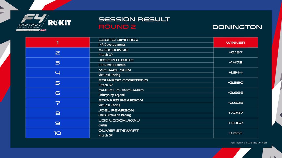 Заедно с Георги на подиума днес се качиха Алекс Дъни и още един пилот на JHR Developments Джоузеф Лоук. Двамата бях част от групата от петима пилоти, които преследваха Георги до самия финал на състезанието, но така и не успяха да го атакуват успешно. Състезателният уикенд в британската Формула 4 приключва по-късно днес с още едно състезание.