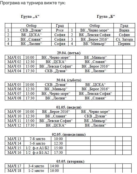 Домакин е ВК Люлин, а спорът за титлата ще се проведе от 29 април до 3 май в зала „Христо Ботев“. Участват осем отбора, които са разделени в две предварителни групи. Група А: Дунав (Русе) ЦСКА, Славия, Люлин (София) Група Б: Черно море (Варна), Левски София, Берое 2016 (Стара Загора), Миньор (Перник) Програма на турнира вижте тук: