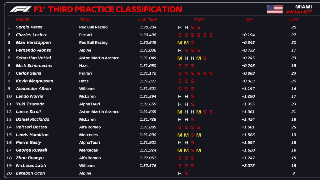 Пилотът на Ред Бул Серхио Перес даде заявка, че ще се бори за своя втори полпозишън от началото на сезон 2022 във Формула 1, след като записа най-доброто време в последната свободна тренировка преди Гран При на Маями. Мексиканецът успя да стигне до 1:30.304 в рамките на третия час за подготовка, с което той бе с 0.194 секунди по-бърз от лидера в световния шампионат Шарл Леклер.