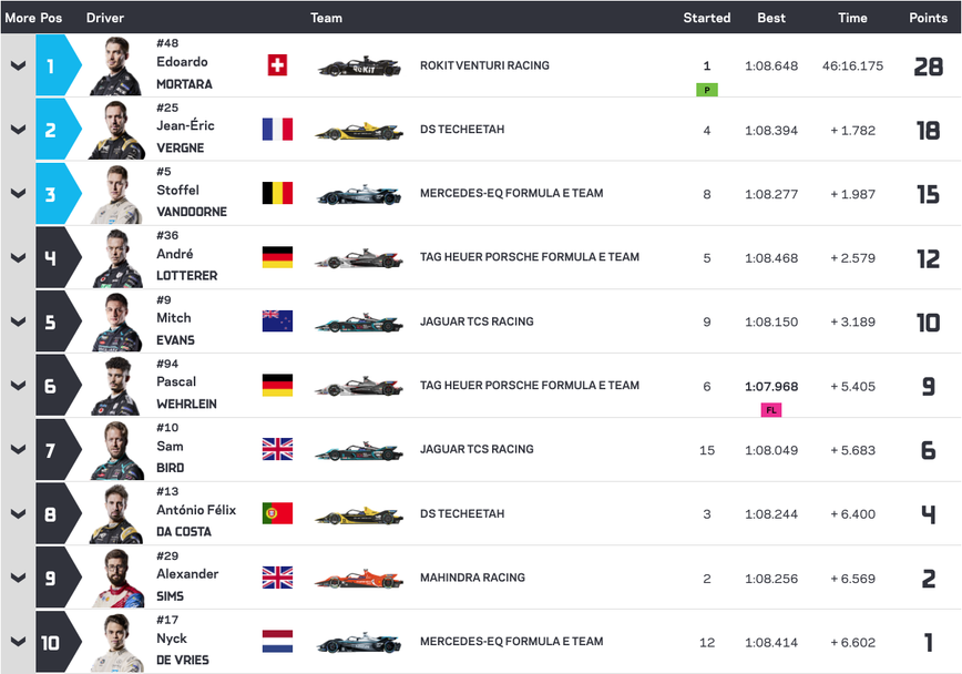 Точки в днешния ден спечелиха още Паскал Верлайн, Сам Бърд, Антонио Феликс да Коща, Алекс Симс и действащият шампион Ник де Врийс. За нидерландеца кампания обаче никак не се развива по план и след седем старта той е едва осми в генералното класиране със само 40 пункта и пасив от цели 56 спрямо първото място.