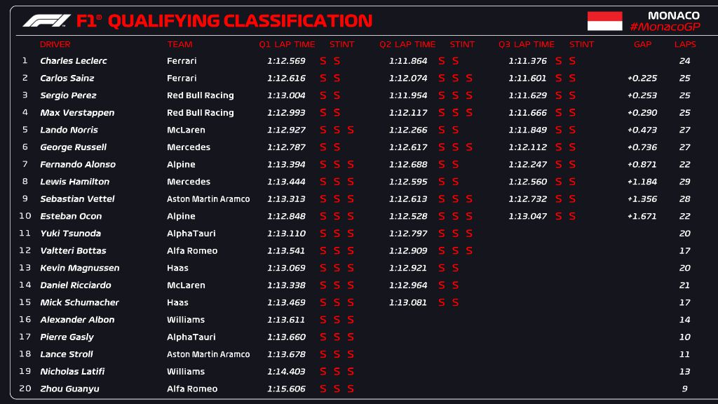 Едва четвърти на стартовата решетка утре ще бъде световният шампион Макс Верстапен, който от началото на уикенда не може да се пребори не само с Леклер и Сайнц, но и със своя съотборник в Ред Бул – Перес. Петото място бе спечелено от Ландо Норис, който участва в Монако с тежка ангина, която той хвана в Испания преди седмица.