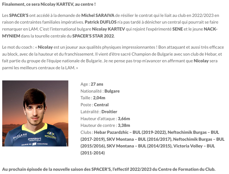 Високият 204 сантиметра централен блокирfвач подсилва френския Спейсърс (Тулуза).