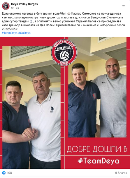 "Една огромна легенда в българския волейбол Каспар Симеонов се присъединява към нас, като административен директор и застава до сина си Венцислав Симеонов в един супер тандем , а опитният и вечно усмихнат Страхил Балов се присъединява като треньор в школата на Дея Волей! Приветстваме ги и очакваме с нетърпение сезон 2022/2023!"