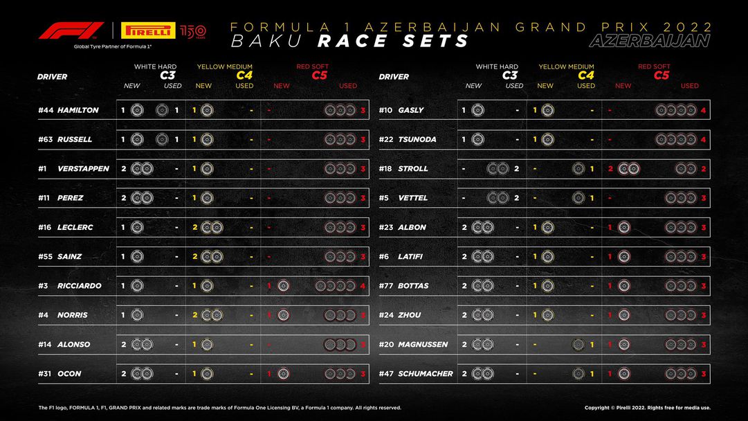 От италианската компания очакват повечето пилоти да заложат на стратегия със само едно влизане в бокса в Баку. Най-бързия вариант за покриване на дистанцията от 51 обиколки според инженерите на Пирели е старт с гумите медиум, с които да се изкарат между 18 и 23 тура. При единственото спиране в бокса състезателите ще сложат смесите хард, с които ще карат до финала.