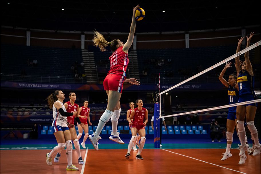 Европейският волейболен шампион Италия записа трета победа в тазгодишната Лига на нациите при жените. Момичетата на селекционера Давиде Мацанти обърнаха и се наложиха над действащия световен шампион Сърбия с 3:1 (21:25, 25:14, 25:15, 25:20) в първия си мач от турнира в Група 3 от втората седмица на Лигата, игран тази нощ пред едва малко над 700 зрители в зала "Арена БиАрБи Нилсон Нелсон" в Бразилия (Бразилия).