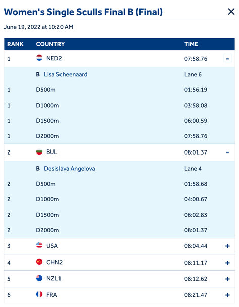 Ангелова финишира втора във Финал Б, след като измина дистанцията от 2000 метра за 8:01.37 минути. Първото място в малкия финал спечели нидерландката Лиса Шеенард с време 7:58.76 минути.