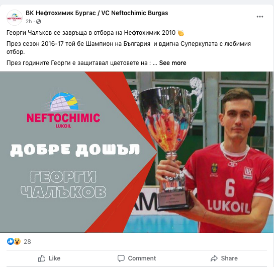 Централният блокировач Георги Чалъков се завръща в отбора на Нефтохимик 2010 (Бургас)