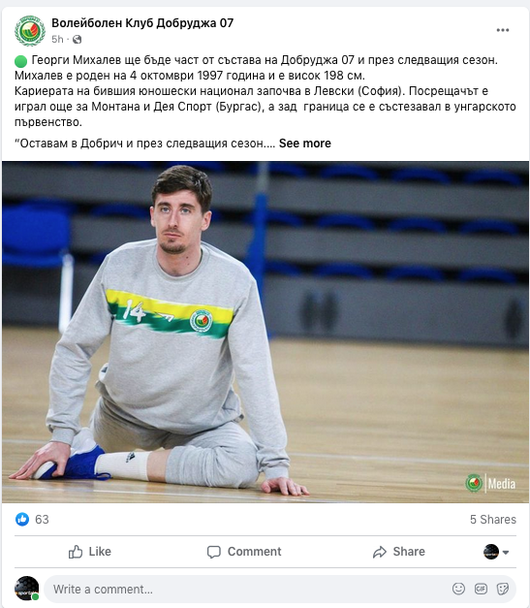 Георги Михалев, който играе на поста посрещач, ще бъде част от състава на Добруджа 07 (Добрич) и през следващия сезон в efbet Супер Волей.