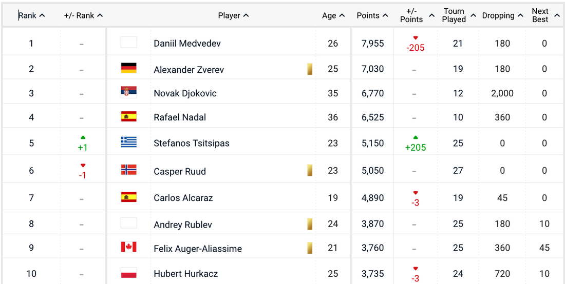 Единствената промяна в топ 10 е размяната на позиции между Стефанос Циципас и Каспер Рууд, като гръцкият тенисист измести норвежеца от 5-ото място. На върха остава Даниил Медведев, който няма да участва на “Уимбълдън” поради наложената забрана от организаторите спрямо играчите от Русия и Беларус. Той е с актив от 7955 точки, а вторият Александър Зверев е със 7030. Новак Джокович е трети с 6770 точки.