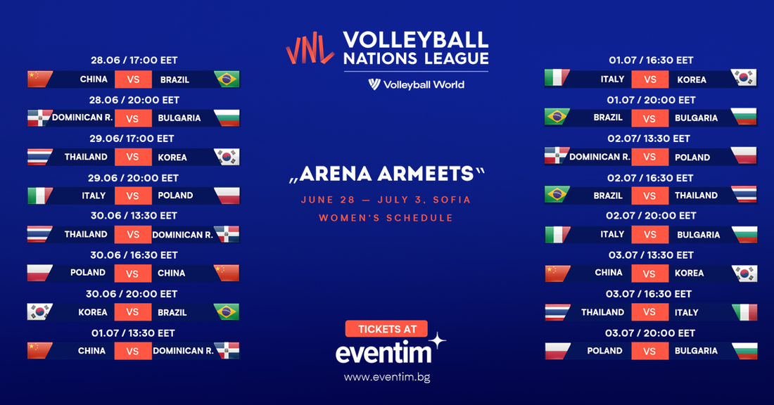 Женският национален отбор на България ще изиграе първия си мач от домакинския турнир от Волейболната лига на нациите в "Арена Армеец" на 28 юни срещу Доминиканска република. На 1 юли "лъвиците" се изправят срещу Бразилия - финалистки от последните две издания на Волейболната лига на нациите, сребърни медалисти от олимпийските игри в Токио и №2 в света при жените в момента. На 2 юли родните националки посрещат актуалните европейски шампионки от Италия. На 3 юли България се изправя срещу Полша. Всички български мачове са от 20 часа.