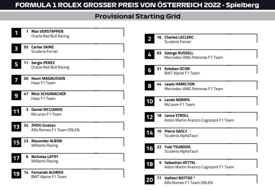 Седми и осми на старта ще бъдат Кевин Магнусен и Люис Хамилтън, а топ 10 ще допълнят вторият пилот на Хаас Мик Шумахер и Ландо Норис. Норис завърши 11-ти в спринта, но ще стартира десети заради наказанието на Валтери Ботас да стартира от дъното на стартовата решетка.