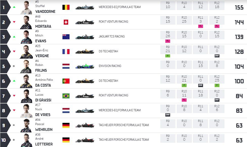 Четвърти и пети финишираха Симс и Бърд, а едва седми се класира действащият шампион Де Врийс. Той бе изпреварен малко преди финала от своя сънародник Робин Фрайнс, а точки от днешния старт взеха още Джейк Денис, Андре Лотерер и Едоардо Мортара, който записа и най-бързата обиколка.