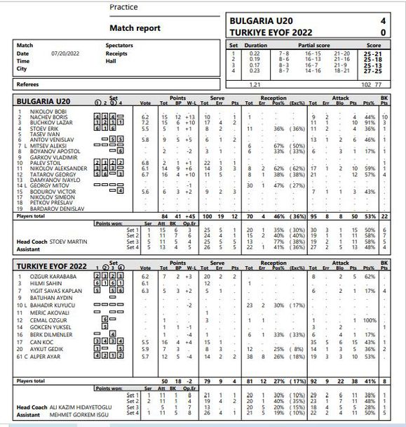 Селекционерът Мартин Стоев даде възможност на целия състав за изява. В първите три гейма българските момчета имаха водеща роля и ги спечелиха безпроблемно. В четвъртата част, след рокади в състава, Турция диктуваше развоя до 20-та точка. Българите обаче не допуснаха обрат, като наложиха волята си в решителните моменти и спечелиха мача по категоричен начин.
