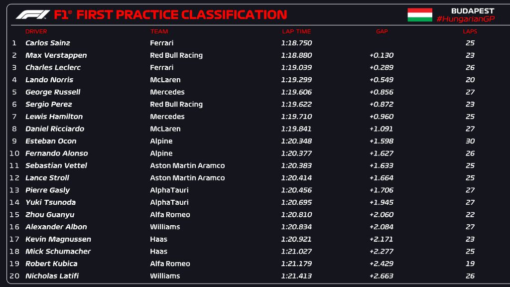 Испанецът успя да направи обиколка за 1:18.750 на „Хунгароринг“ в меките гуми на Пирели, като по този начин той бе с 0.130 секунди по-бърз от Макс Верстапен, който също бе със софт смесите. Тройката в края на първия час за подготовка край Будапеща затвори вторият пилот на „Черните кончета“ Шарл Леклер, който бе с 0.289 по-бавен от своя съотборник, отново с меките гуми.