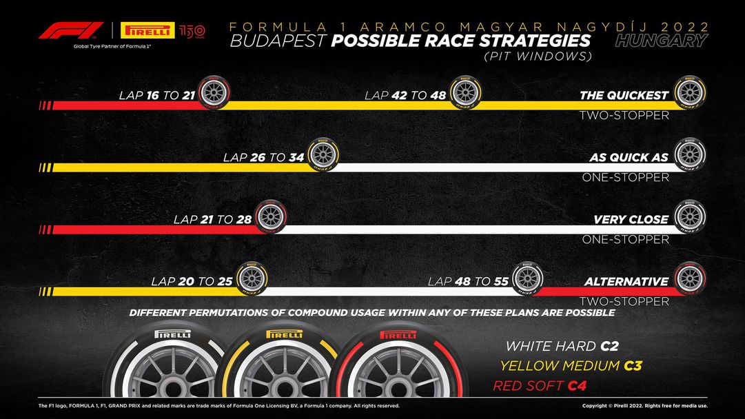 Най-бавна ще бъде стратегията, която включва използването и на трите типа гуми за сух асфалт. В този случай първият стинт ще бъде с продължителност от между 20 и 25 обиколки с медиум, след което втората серия от обиколки ще бъде с хард. Тази стратегия ще позволи завършек на състезанието със софт, които да бъдат поставени на колите между 22 и 15 обиколки преди финала.