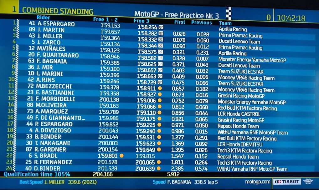 Световният шампион Фабио Куартараро с Ямаха, който преследва втора поредна победа на „Силвсъртоун“ този уикенд остана шести на 0.328 зад своя най-близък преследвач в генералното класиране. Седми се нареди Франческо Баная от Дукати, а останалите места в топ 10, които дават право на директно участие във втората фаза на квалификацията по-късно днес, бяха заети от Жоан Мир (Сузуки), Лука Марини (ВР46 Дукати) и Алекс Ринс (Сузуки).