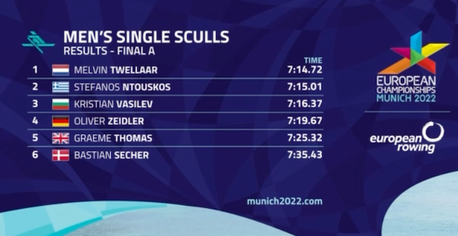 Кристиан Василев спечели бронзов медал в дисциплината скиф за мъже на Европейското първенство по гребане в Мюнхен.