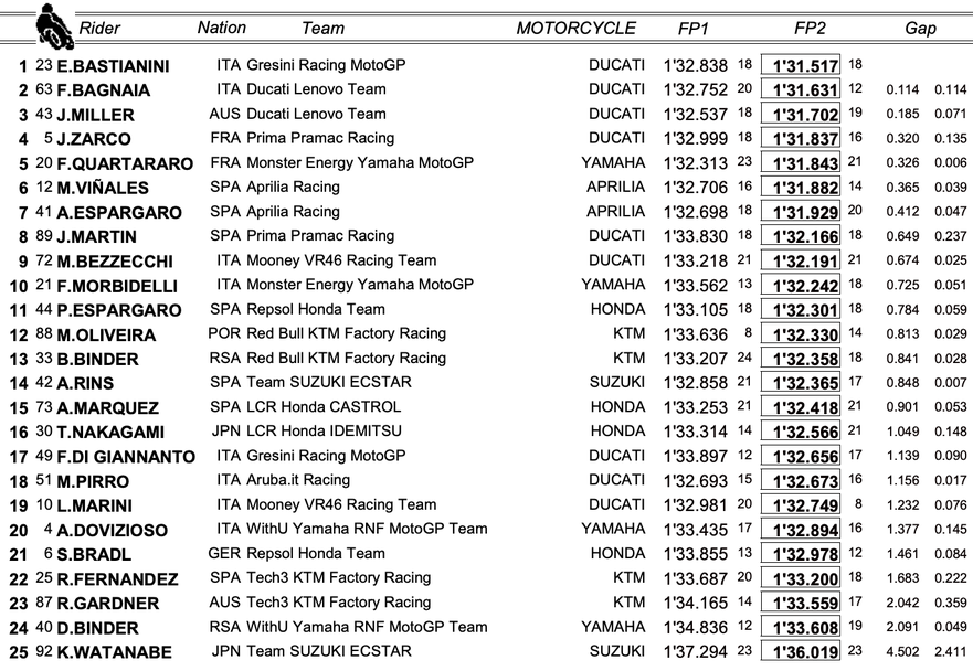 Италианецът се възползва перфектно от факта, че в своя рекорден тур кара директно зад своя бъдещ съотборник в Дукати Франческо Баная. В крайна сметка Баная зае второто място, с пасив от 0.114, въпреки че имаше едно падане в началото на сесията на 13-я завой. Тройката след края на вторите 45 минути за подготовка допълва настоящият втори пилот на Дукати Джак Милър, който бе с 0.185 по-бавен от бъдещия си наследник.