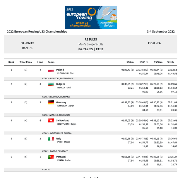 Нейков измина дистанцията от 2000 метра за 7:19.65 минути и финишира втори.