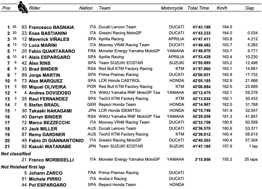 Топ 10 в Гран При на Сан Марино допълниха Алекс Ринс, Брад Биндър, Хорхе Мартин и Алекс Маркес, а точки от надпреварата за „Мизано“ спечелиха още Мигел Оливейра, участвалия в последния старт в своята кариера Андреа Довициозо, Раул Фернандес, Щефан Брадъл и Такааки Накагами.