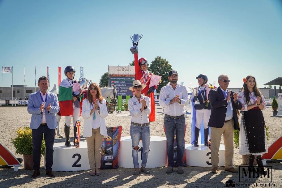 Злато, сребро и бронз спечелиха българските състезатели по конен спорт на Балканиадата по прескачане на препятствия в Румъния. Златни медали заслужиха Ая Митева в клас „Млади ездачи“, в който България за първи път е с балкански шампион, и Ивайло Бонев в категория „Мъже“. Анна Гочева е носител на сребърно отличие в клас "Амазонки“, а Десислава Миланова - на бронзов медал при юношите, съобщиха от Българската федерация по конен спорт.