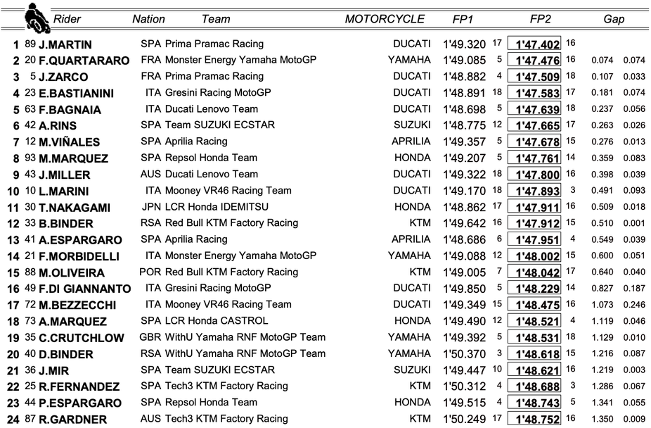 Тройката в края на вторите 45 минути за подготовка на испанското трасе допълни вторият пилот на Прамак Дукати Йоан Зарко, който бе с 0.107 по-бавен от своя съотборник. Четвърти и пети се наредиха двамата бъдещи съотборници в Дукати Енеа Бастианини и Франческо Баная, които бяха със съответно 0.181 и 0.237 по-бавен от Мартин.