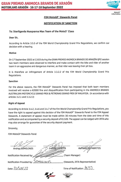 Двама от механиците на отбора на Стерилгарда Макс Рейсинг Тийм в клас Moto3 на световния шампионат по мотоциклетизъм на писта получиха тежки наказания след вчерашната квалификация за Гран При на Арагон. И двамата ще трябва да заплатят глоби от по 2000 евро, а освен това и няма да бъдат допуснати до участие в две състезания по-късно през сезона.