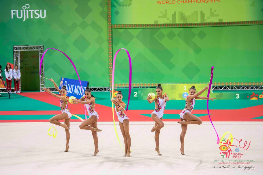 Ансамбълът на България триумфира с титлата във финала на три ленти и две топки на Световното първенство по художествена гимнастика в София. Момичетата на треньора Весела Димитрова бързо успяха да се съвземат от осмото място на пет обръча и изиграха брилятно композицията си пред изпълнените до краен предел трибуни на зала “Арена Армеец”. Женина Трашлиева, Рейчъл Стоянов, София Иванова, Маргарита Василева, Камелия Петрова и Радина Томова получиха обща оценка 33.300 точки, от които 16.500 за трудност, 8.600 за артистичност и 8.200 за изпълнение.