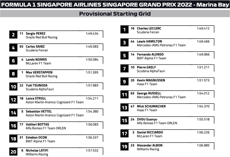 Още по-лошата новина за Верстапен е, че неговите най-близки преследвачи в генералното класиране Шарл Леклер и Серхио Перес ще стартират от първата редица по-късно днес, като монегаскът ще бъде на полпозишъна. На втората редица ще се наредят Люис Хамилтън и Карлос Сайнц, а на третата Фернандо Алонсо и Ландо Норис. Компания на Верстапен не четвъртия ред ще прави бившият му съотборник Пиер Гасли, а точно зад двамата ще потеглят Кевин Магнусен и Юки Цунода, които ще допълнят топ 10 на стартовата решетка.