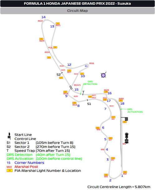 Откакто Формула 1 въведе в употреба системата DRS в началото на 2011 година пистата „Сузука“ в Япония е една от малкото, на които пилотите винаги са имали възможност само веднъж в рамките на обиколката да отварят задното си крило. Това винаги се е случвало на старт-финалната права, а през 2022 година отново само на нея пилотите ще могат да използват системата си за намаляване на челното съпротивление.